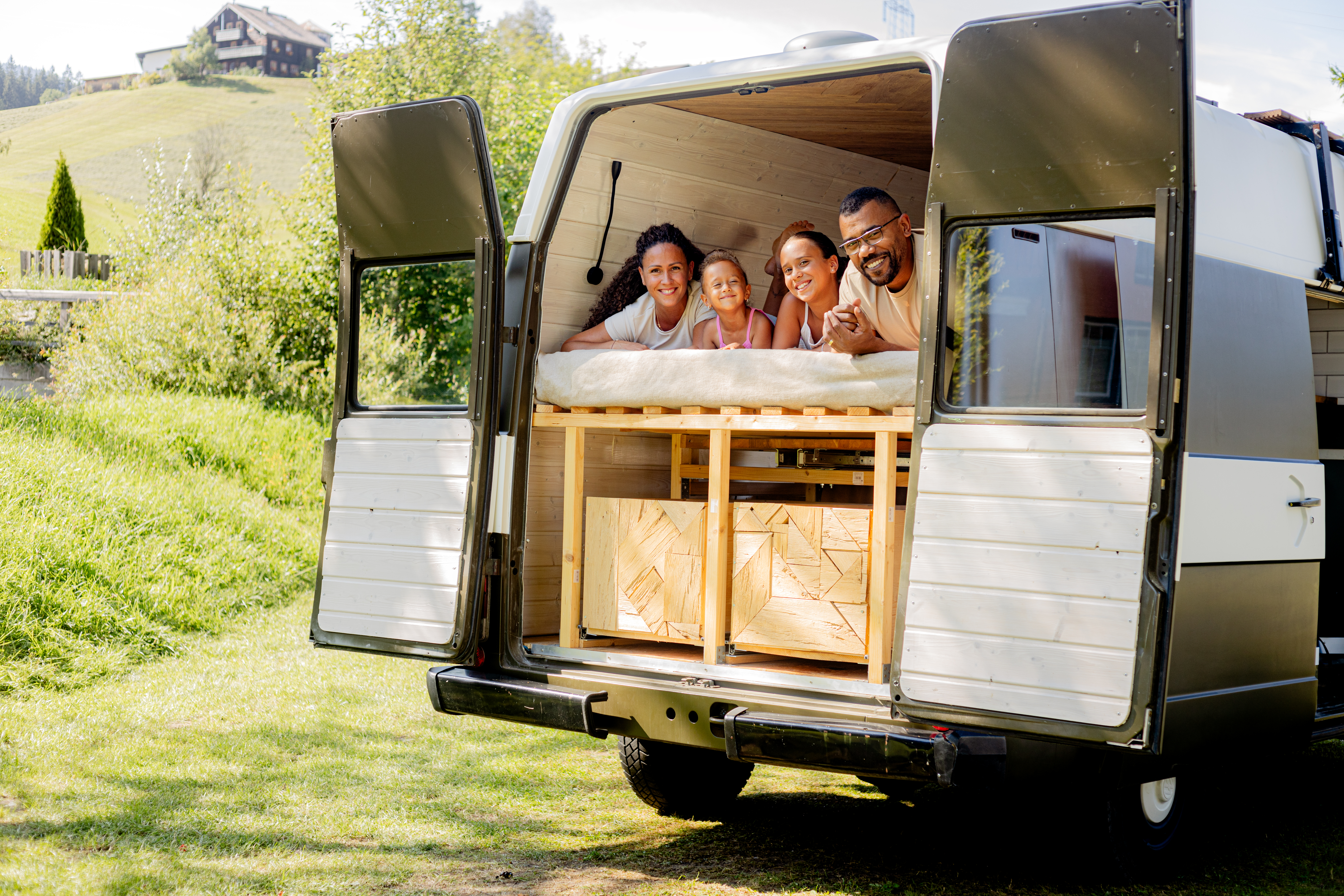 Drinnen duftet es nach Holz, draußen wartet der Bergblick – direkt vom Bett aus. Ein gemütliches 2×2 m-Bett nimmt fast den ganzen Raum ein, begleitet von zwei bequemen Sesseln zum Zurücklehnen und Träumen. Die große Glasfront holt die Natur direkt ins Haus, während draußen eine Holzterrasse mit Sitz- und Liegemöglichkeiten zum Entspannen einlädt – barfuß, in der Sonne, mit Blick ins Grüne.
